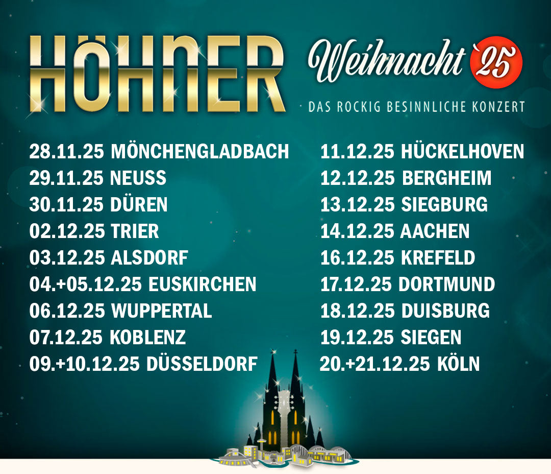 Vom 28.11. bis 21.12.2025 geht es wieder weihnachtlich zu im Hause Höhner. Mit rockigen aber auch besinnlichen Tönen sind die Konzerte der Weihnachtstour der perfekte Begleiter für die Adventszeit. Karten gibt es ab sofort zu kaufen!
