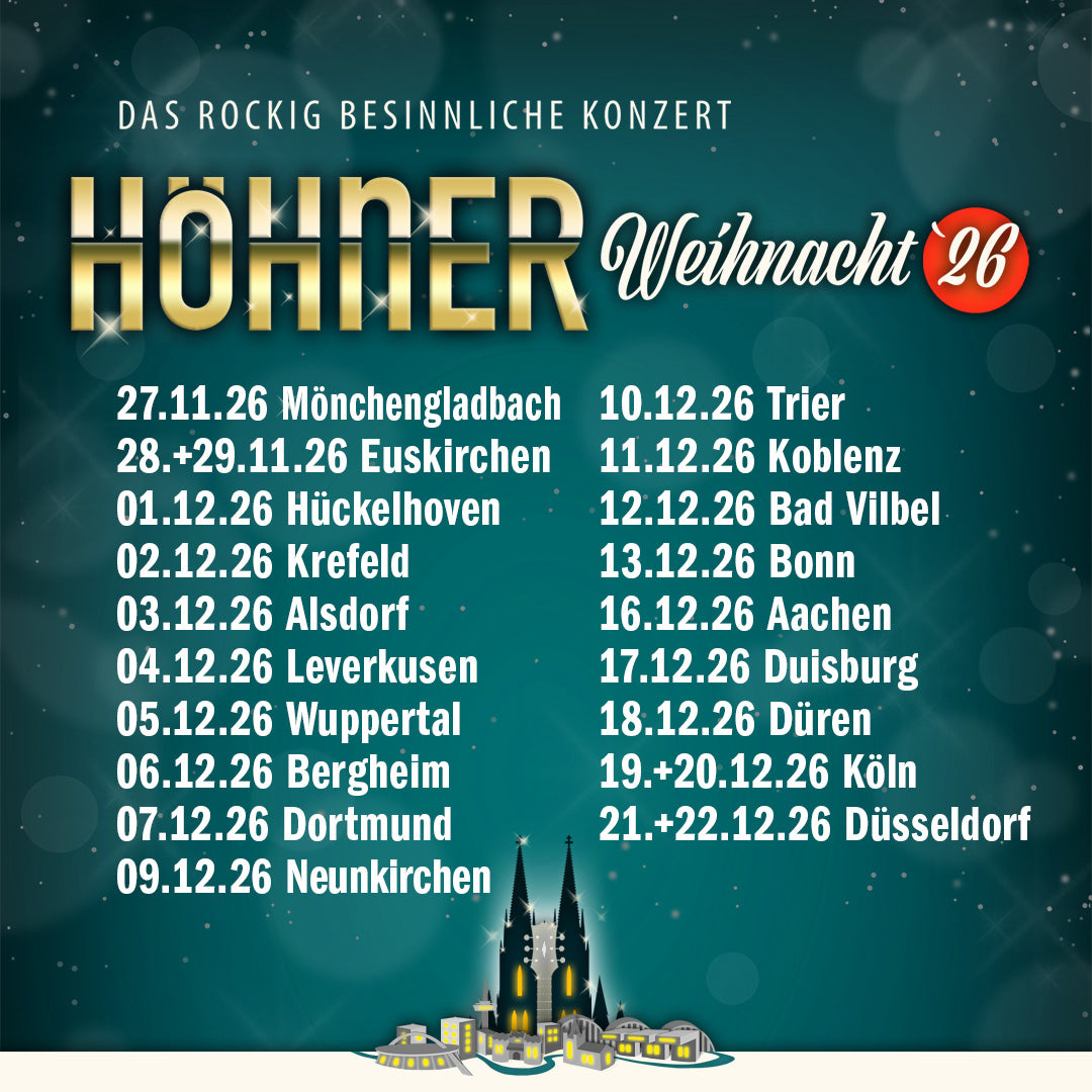Auch 2026 gehen wir mit unserer HÖHNER WEIHNACHT wieder auf Tour! Seid dabei und stimmt euch mit uns gemeinsam auf das Fest der Liebe ein.
