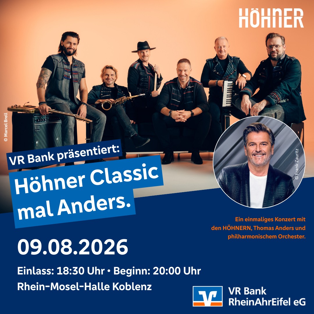 Bereits seit über drei Jahrzehnten begeistert das Konzertformat Höhner Classic das Publikum und nun kommt dieses außergewöhnliche Musikerlebnis erstmals in dieser exklusiven Form nach Koblenz. Gemeinsam mit dem Orchester entsteht ein Abend voller großer Gefühle und unvergesslicher Klangmomente.